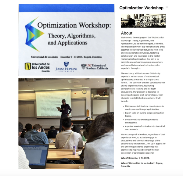 The Optimization Workshop: Theory, Algorithms, and Applications was held in December 2024 in Bogotá, Colombia, at the Universidad de los Andes. The event brought together a diverse group of researchers and students from both local and international institutions, with the goal of strengthening collaboration in the field of mathematical optimization and promoting research in the region, particularly among early-career scholars.